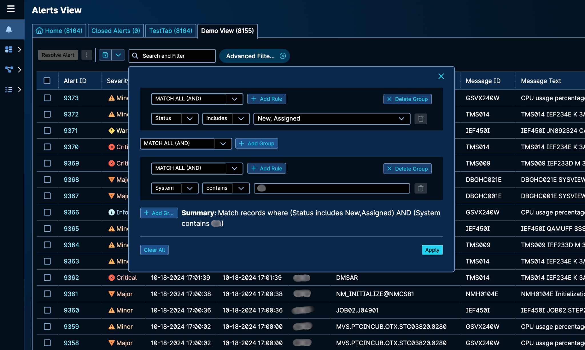 Group filter criteria into logical statements, which users may create and save as custom filters, or deploy as tabs for a highly focused alert view.